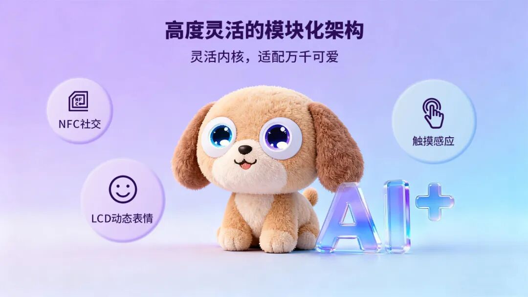 针对玩具市场“多品类、快迭代”的需求,Animator采用高度灵活的?榛芄,支持触摸感应、LCD动态表情、NFC社交等功能?榈淖杂裳∨洹F笠悼梢愿莶肥谐《ㄎ,快速适配低-中-高端毛绒玩具市场需求。